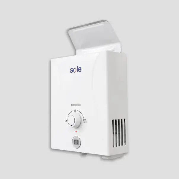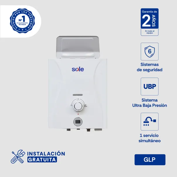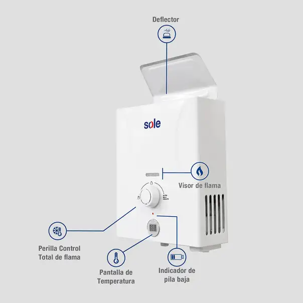 5.5 litros por minuto, tiro natural, Tipo A, GLP, no requiere ducto de evacuación de gases